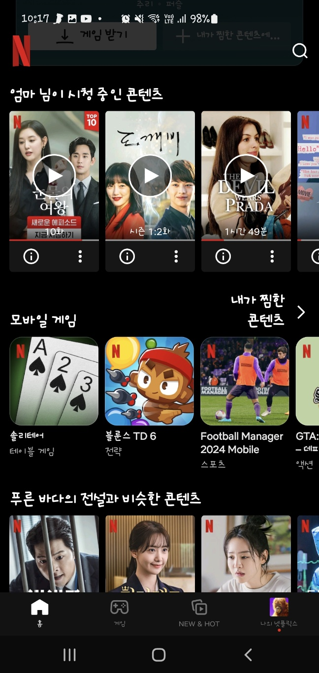 넷플리스 시작할 때, 영화, 드라마, 애니메이션 등의 다양한 장르를 확인 및 검색할 수 있어요. 다운로드하고 싶은 영상을 검색하거나 찾아서 선택합니다.