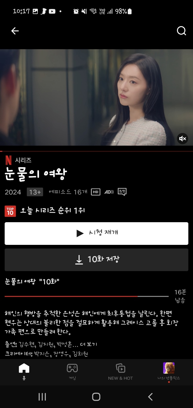 요즘 핫한 <눈물의 여왕> 드라마 입니다. 제가 좋아하는 명품 배우 김수현 씨가 출연하기 때문에 몰입이 더욱 잘돼요. 연기력 정말 감탄입니다. 아우라가 막 보여요. ㅎㅎㅎ <눈물의 여왕>를 선택하면 화면에서처럼 재생과 11회 저장이 있어요. 오프라인으로 보고 싶을 때 저장을 누르시면 됩니다.