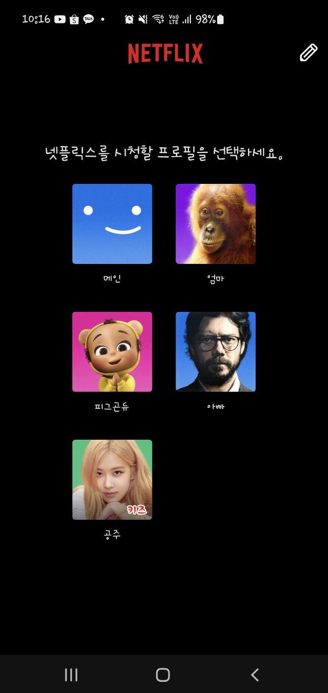 넷플릭스에서 제공하는 영화, 드라마, 애니메이션등이 있습니다. 오프라인으로 저장이 가능한데요 넷플릭스 앱을 실행 후 자신의 계정 프로필을 찾아 선택합니다.