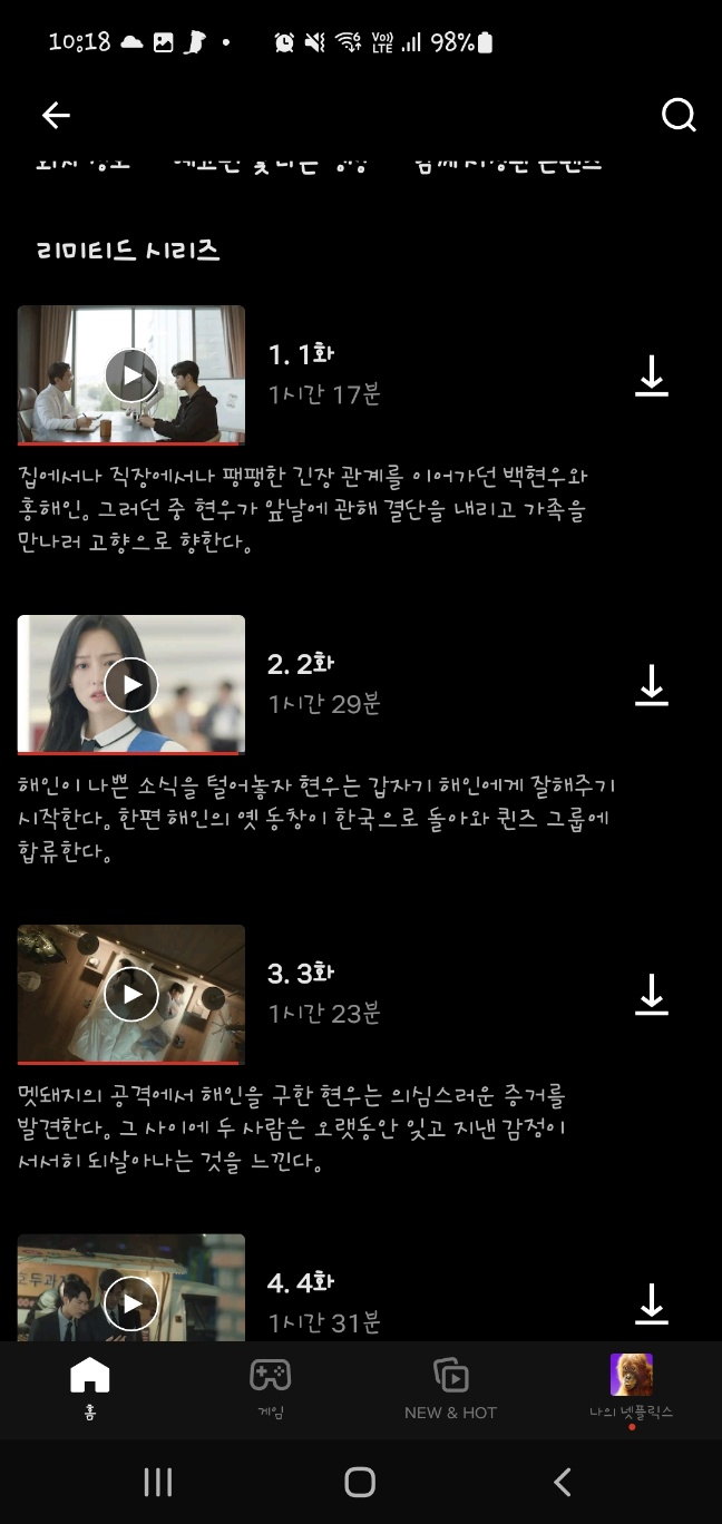 넷플릭스에서 제공하는 드라마의 경우 회차가 보통 적게는 15개에서 20개 정도입니다. 회차를 모두 하나씩 찾아 다운로드를 클릭하는 것은 번거롭죠. 연속적으로 다운로드를 진행하고 싶을 경우 하단에 위치해 있는 회차를 찾아주시면 됩니다. 각 회차의 우측에 보이는 다운로드 아이콘을 연속적으로 선택하시면 번거로운 것이 해결이 됩니다.