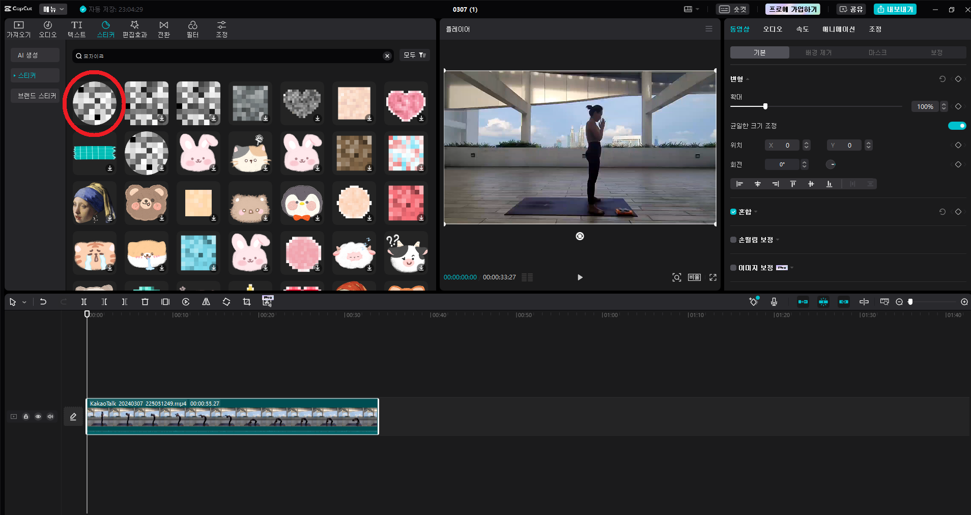 원하는 위치에 모자이크를 추가하려면, 스티커 기능을 활용합니다. 상단 메뉴에서 스티커를 클릭하고 아래의 검색창에 '모자이크'라고 검색합니다. 저는 얼굴을 모자이크처리하려고 동그라미 모양의 모자이크를 선택했습니다.