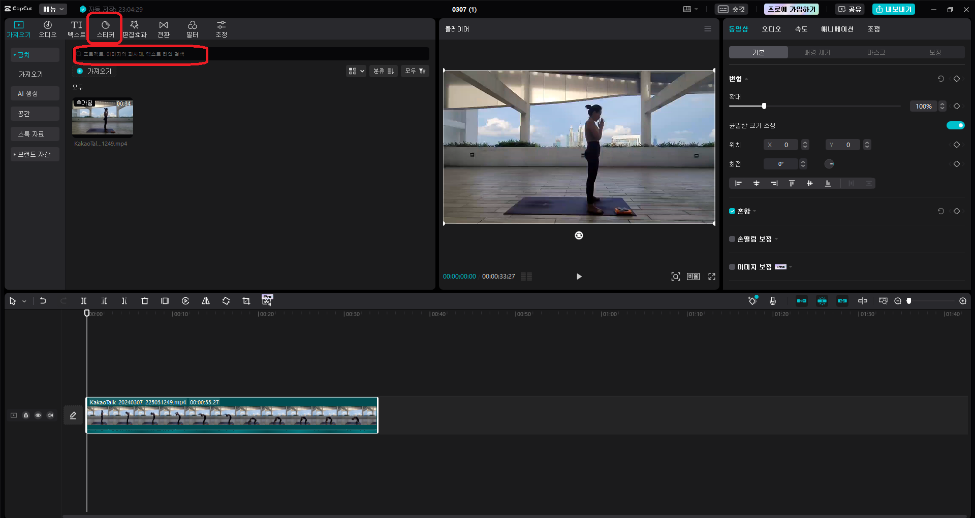 먼저 컷 PC 버전을 실행하고 모자이크 처리를 하고 싶은 영상을 불러옵니다. 원본 영상을 재생해 보면서 모자이크 처리할 부분을 확인합니다. 저는 제가 가지고 있는 영상 중에 요가하는 모습을 담은 영상으로 모자이크 처리를 보여드리겠습니다.