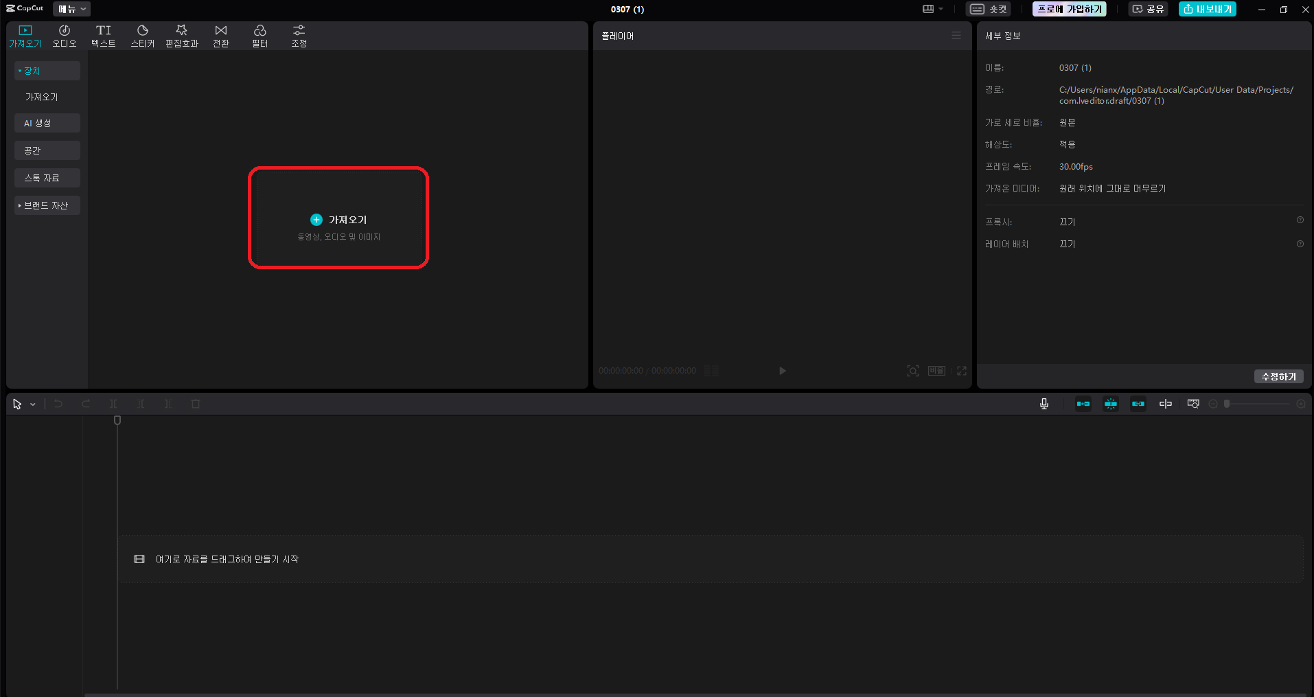 가져오기 한 파일을 타임라인에 드래그 앤 드롭합니다.