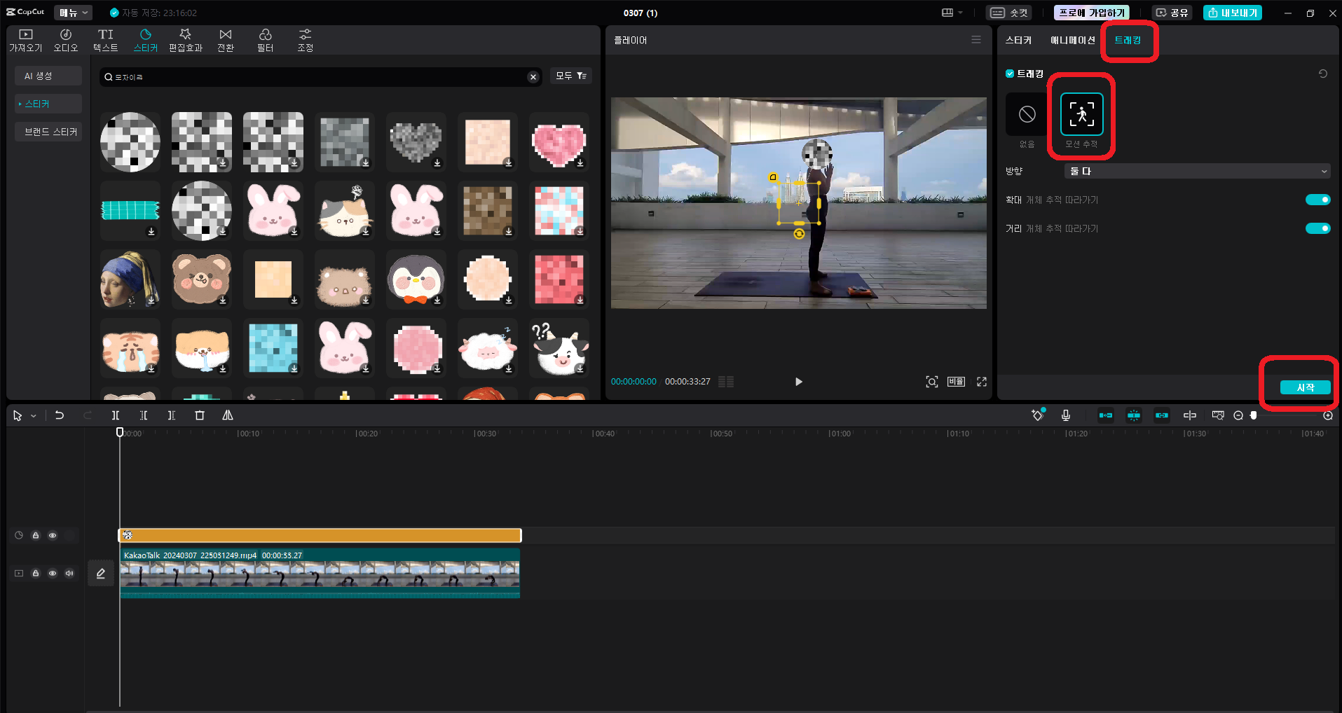 더 자세한 모자이크 효과를 위해 얼굴 추적을 사용합니다. 모자이크한 부분에 스티커 애니메이션 트래킹을 선택하고, 얼굴 위치를 추적합니다. 트래킹이 완료되면 플레이를 눌러 얼굴에 모자이크가 따라다니는지 확인합니다.