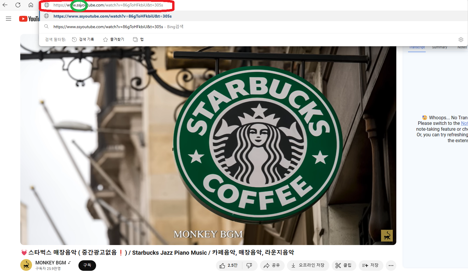 유튜브에서 원하는 영상이나 음원을 고릅니다. 상단 주소창을 클릭해서 수정할 수 있도록 합니다. 이때, 이 파일은 본인만 소장하셔야 합니다. 지인이나 커뮤니티에 공유하게 되면 저작권 문제가 발생할 수 있습니다.