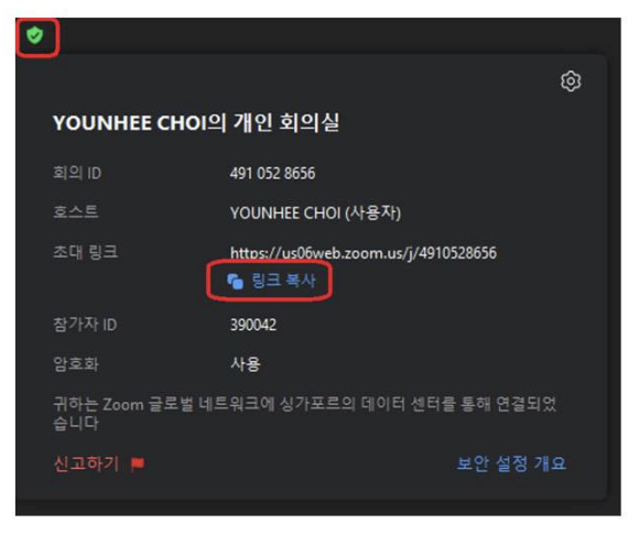 줌 전체 화면에서 상단 왼쪽 초록색 방패 모양을 클릭합니다. 중간에 파란색 ‘링크 복사’를 누르시면 자동으로 링크가 복사됩니다. 이것을 카톡이나 이메일, 문자 등에 붙여넣기 하셔서 상대방에게 보내시면 됩니다.