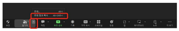줌 전체화면의 하단에 [메뉴]가 나옵니다. 하단의 메뉴에서 참가자 옆 꺾쇠를 누르시면 ‘초대 링크 복사’가 나옵니다. 초대 링크 복사를 누르시면 자동으로 복사가 됩니다. 이것을 카톡이나 이메일, 문자 등에 붙여 넣기 하셔서 상대방에게 보내시면 됩니다.