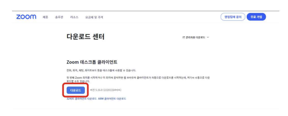 스마트 폰으로 줌을 사용하실 경우에는 ‘zoom’ 앱만 설치해도 줌 회의에 참여하실 수 있습니다. PC로 사용 시에는 PC 버전 다운로드를 하시면 됩니다. 줌 사이트에 들어가셔서 ‘zoom’ 사용을 위해 다운로드 센터로 들어갑니다. zoom 데스크톱 클라이언트에서 파란색 버튼 ‘다운로드’를 클릭해 줌 프로그램을 다운로드하면 됩니다.