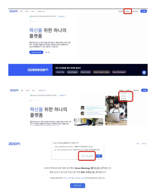 줌 회의를 열 때는 [주최하기] - [비디오켜기] - [Zoom Meeting 열기]의 순서로 진행합니다.