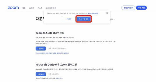 줌 사이트에 들어가서 ‘모든 쿠키 허용’을 클릭합니다.