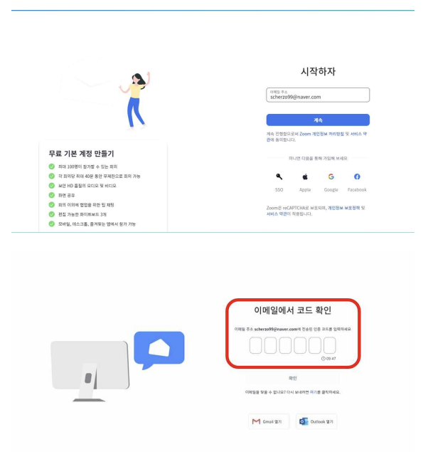 회원 가입 시 아이디는 사용하시는 이메일 주소로 합니다. 가입을 원하는 이메일을 입력 후 ‘계속’을 누릅니다. 다음 창에서 회원 가입한 이메일로 인증 코드를 확인해서 인증하라는 메시지가 나옵니다. 회원 가입한 이메일 주소에서 인증코드 확인해서 입력하면 됩니다.