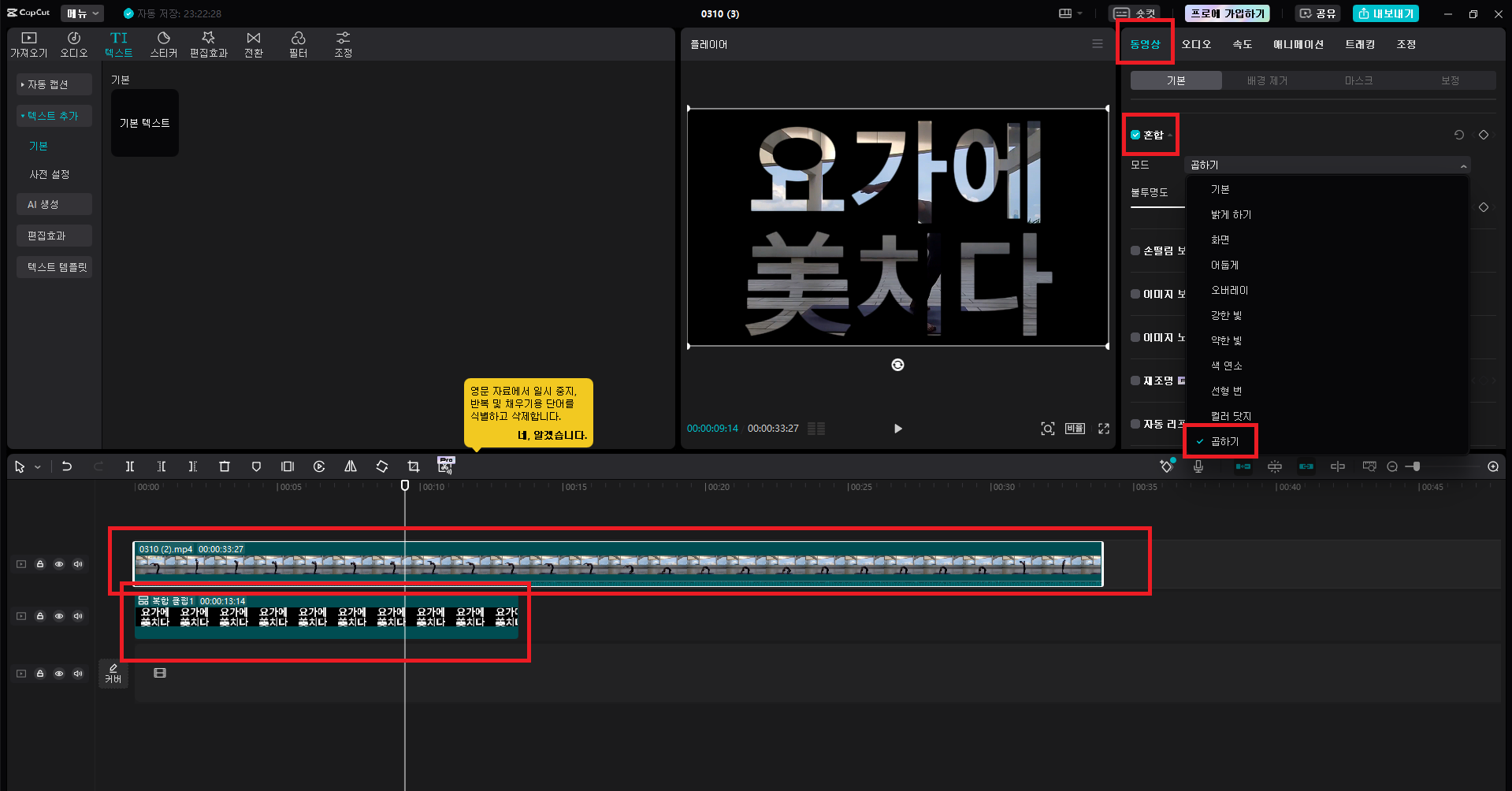 이미지를 클릭한 후에 오른쪽 하단에 있는 혼합 모드를 변경합니다. 일반 모드에서 곱하기 모드로 변경하여 제목 뒤에 영상이 플레이되는 효과를 만듭니다.