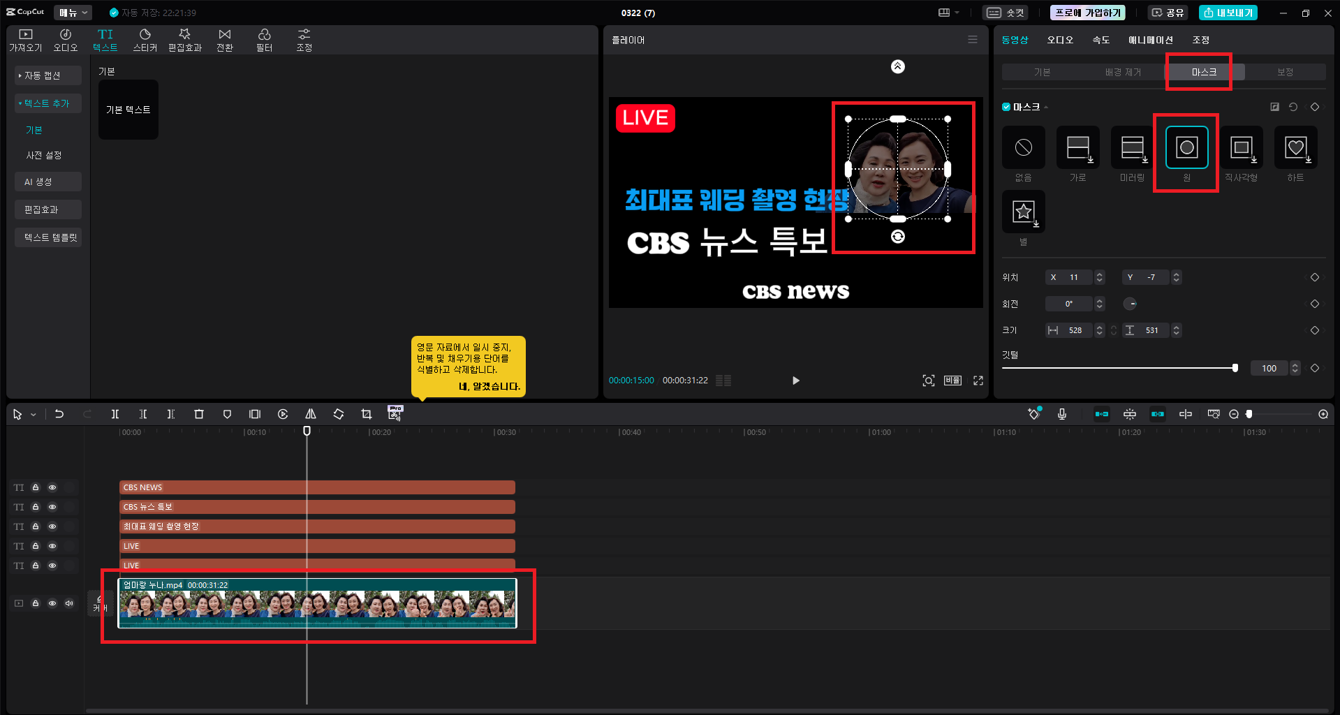 마스크 적용: 썸네일에서 원하는 부분을 선택했다면 이제 마스크를 적용할 차례입니다. Capcut의 마스크를 사용하면 흐리게 하거나 그라디언트를 추가하는 등 다양한 효과를 만들 수 있습니다. Capcut의 편집 도구 모음이나 효과 패널에서 마스크 옵션을 찾으세요. 흐림 마스크나 그라데이션 마스크 등 적용하려는 마스크 유형을 선택합니다.