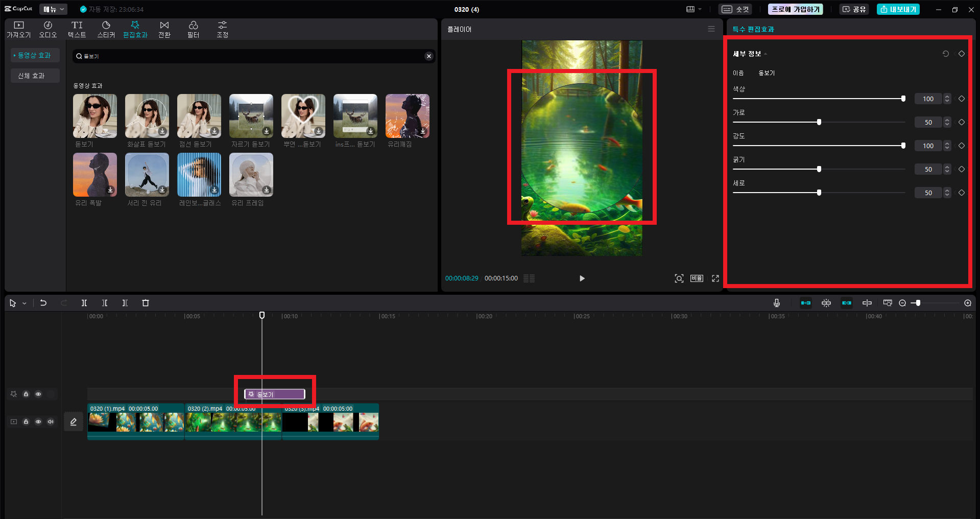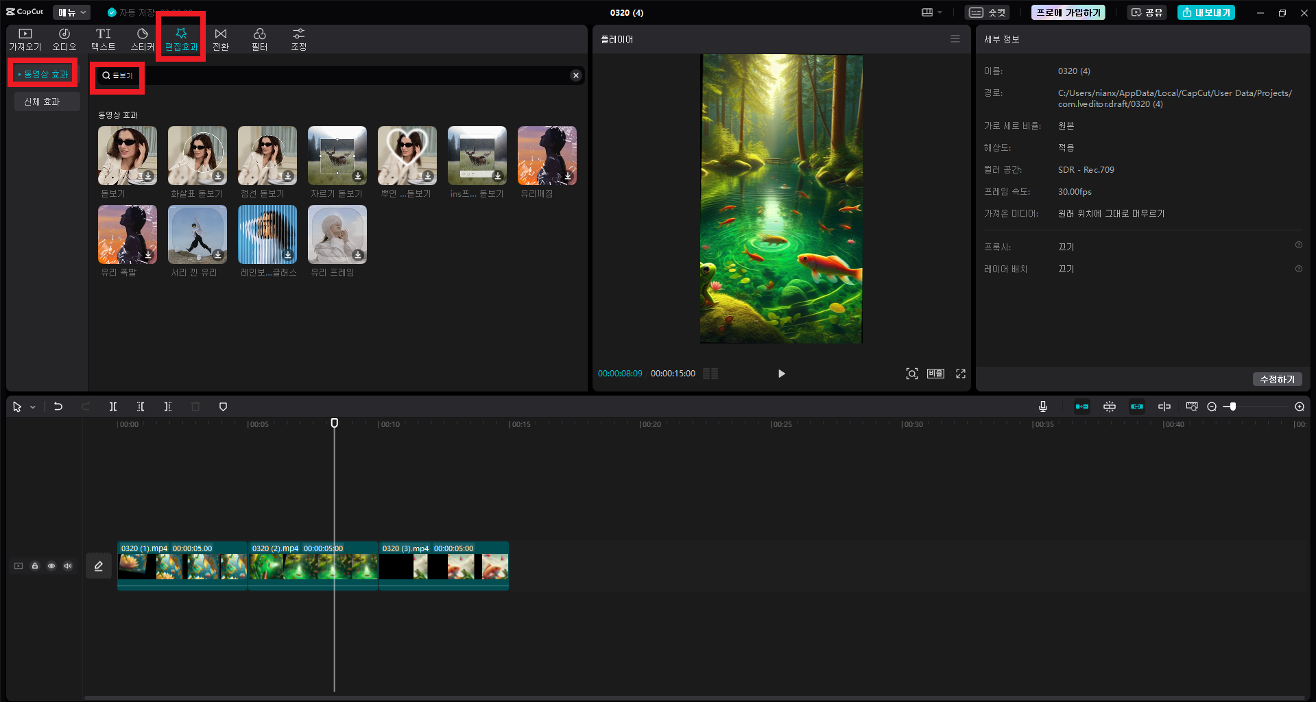 동영상을 편집하는 도중 특정 부분을 강조하기 위해서는 먼저 확대 기능을 활성화해야 합니다. 편집 도구를 사용하여 원하는 부분을 선택한 후, 다음 단계를 따라주세요: 미디어 오디오 텍스트 스티커 편집 등의 편집 옵션 중 '편집 효과'를 선택합니다.