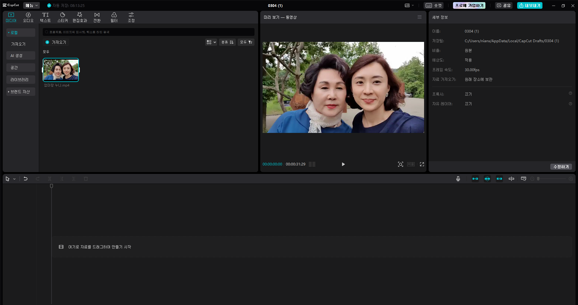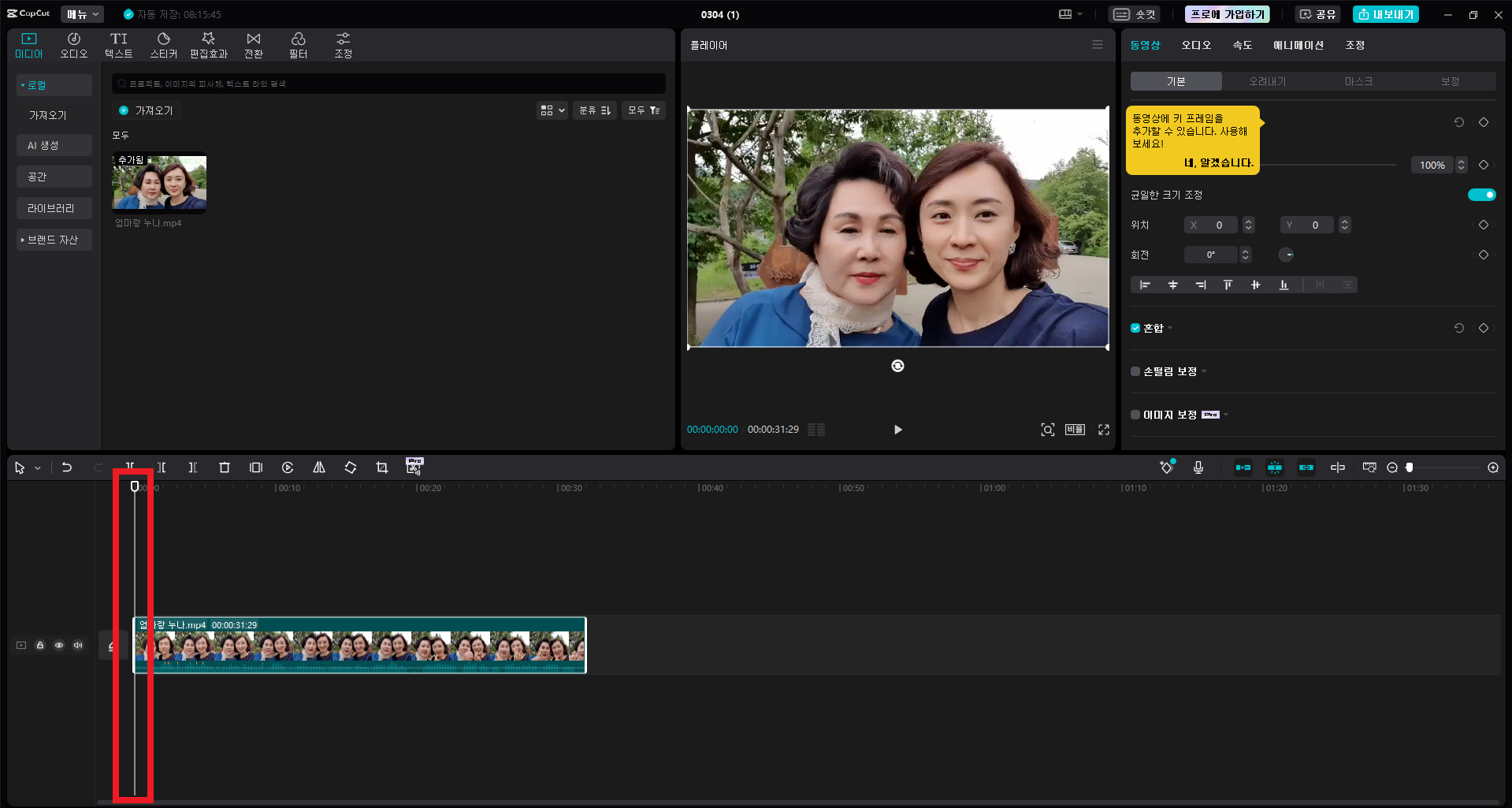 새 프로젝트를 생성하고 미디어, 오디오, 텍스트, 스티커 등 다양한 편집 효과를 활용해보세요. 필요한 파일은 '가져오기'를 통해 불러올 수 있습니다. 편집을 원하는 영상을 가져오기 합니다. 가져오기가 완료되면 가운데 영역에서 미리보기 - 동영상을 확인할 수 있습니다. 본격적으로 영상 편집을 하려면 하단에 '여기로 자료를 드래그하여 만들기 시작' 영역에 가져온 동영상을 끌어다 놓으면 됩니다.