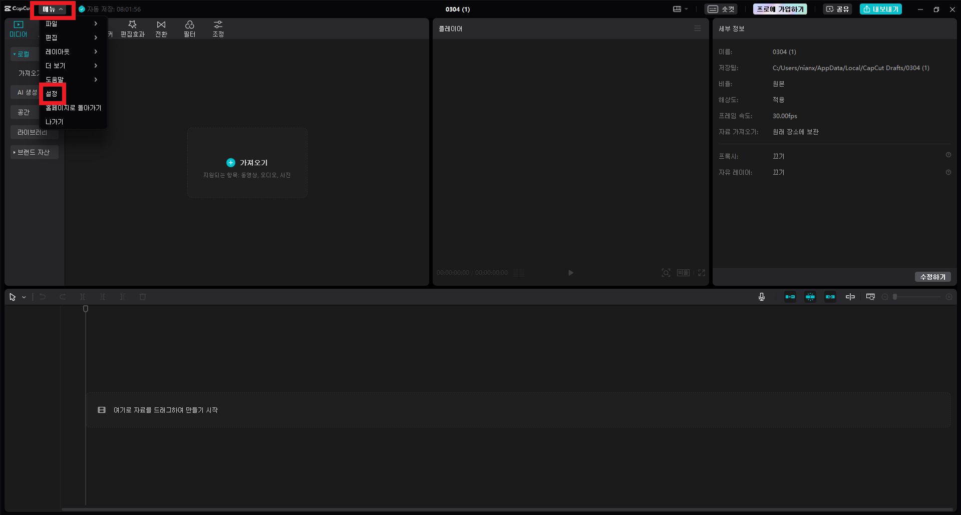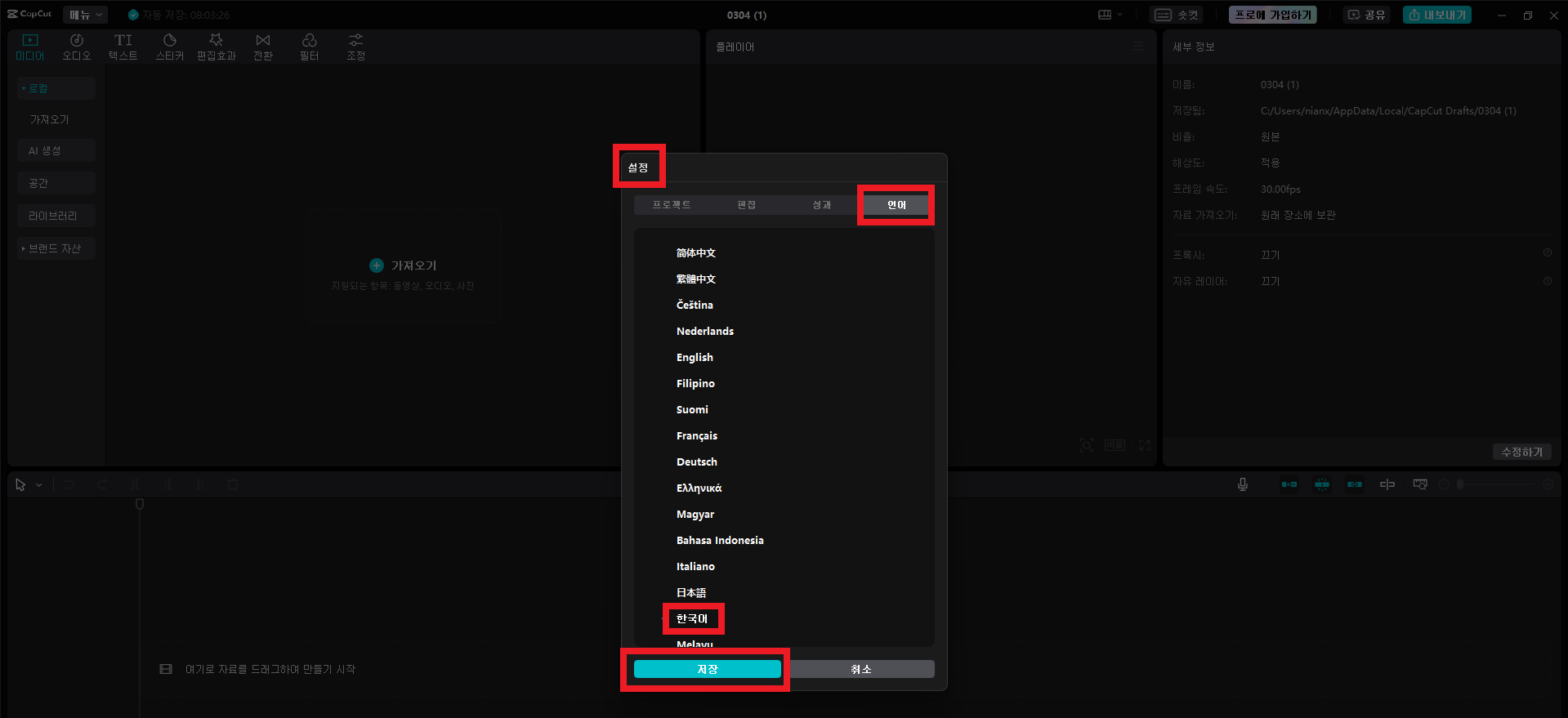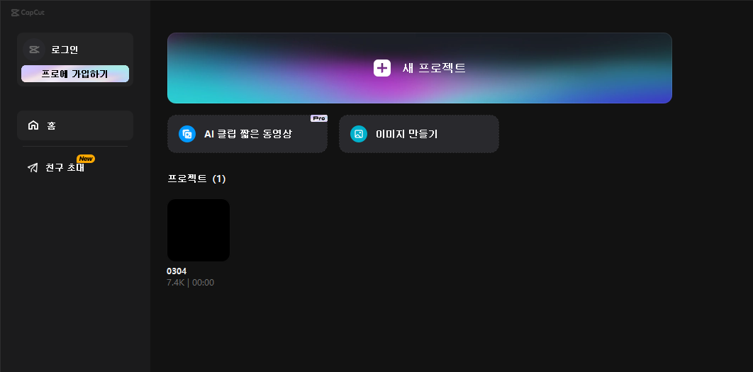 프로그램을 실행한 후 로그인을 요구하지만 로그인 없이도 직접 사용할 수 있습니다. 언어는 위의 사진과 같이 한국어로 선택 후 '저장' 버튼을 누르시면 됩니다. 위의 사진은 캡컷 프로그램을 다운로드한 후 자동으로 언어 선택이 뜬 것입니다. 만약 저와 다르게 언어 선택이 나오지 않는다면 '뉴 프로젝트'를 선택하여 새로운 작업을 시작합니다. 화면 최상단 메뉴 -> 설정 -> 언어로 들어가셔도 됩니다. 언어를 한국어로 변경해주면 작업이 편리해집니다.