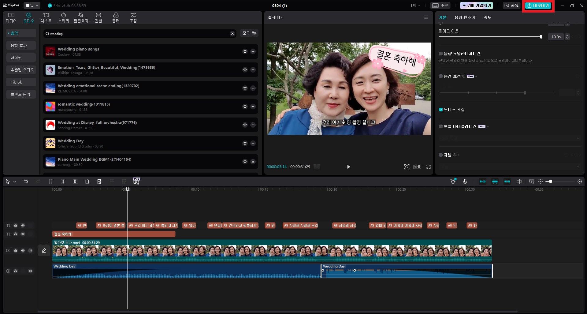 작업이 완료되면 영상의 전체 모습을 미리보기에서 확인할 수 있습니다. 원하는 텍스트, 오디오, 자막 등을 입력하고 최종 편집이 완성되었다면 오른쪽 상단의 '내보내기' 하시면 영상을 다운로드할 수 있습니다. 다운로드한 영상은 유튜브에 업로드할 수 있습니다.