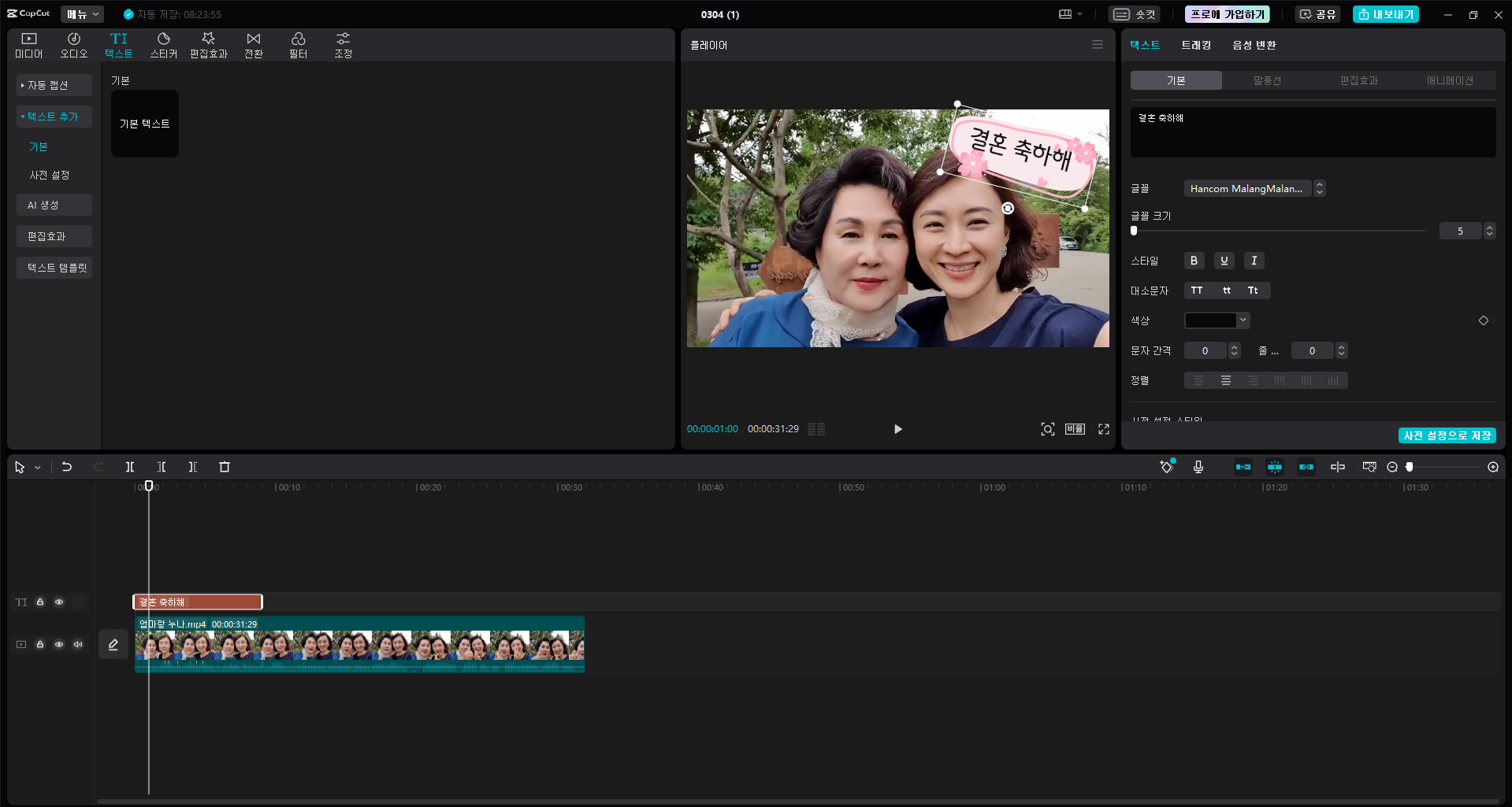 로고나 이미지를 드래그 앤 드롭으로 추가하고, 텍스트를 원하는 위치에 삽입해보세요. 글꼴, 크기, 색상, 배경 등을 쉽게 조절할 수 있어 눈에 띄는 효과를 낼 수 있습니다. 이미지나 텍스트를 삽입하려면 상단 메뉴를 활용하면 됩니다. 저는 텍스트를 넣어보겠습니다. 상단의 텍스트를 클릭하면 바로 아래에 기본 서체라는 것이 나옵니다. 미리보기 오른쪽에 보면 텍스트 편집에 대한 자세한 기능이 보입니다. 여기에 원하는 텍스트를 입력하고 글꼴, 크기, 색상, 배경 등을 자유롭게 선택하면 됩니다. 저는 3년 전 동생의 결혼식 영상이 있어 가져오기를 한 후 '결혼 축하해'라는 텍스트를 넣었습니다. 말풍선을 텍스트와 함께 만들어 보았습니다.