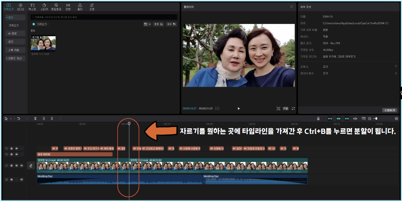 이제 타임라인에 동영상을 불러온 후, 익숙한 자르기와 붙이기 작업을 수행해 보겠습니다. 타임라인에서 자르고 싶은 부분을 선택하고, '컨트롤 B'를 눌러 해당 부분을 자를 수 있습니다. 이렇게 간단한 명령어로 동영상을 원하는 부분으로 나눌 수 있습니다.