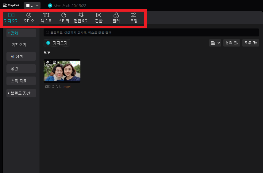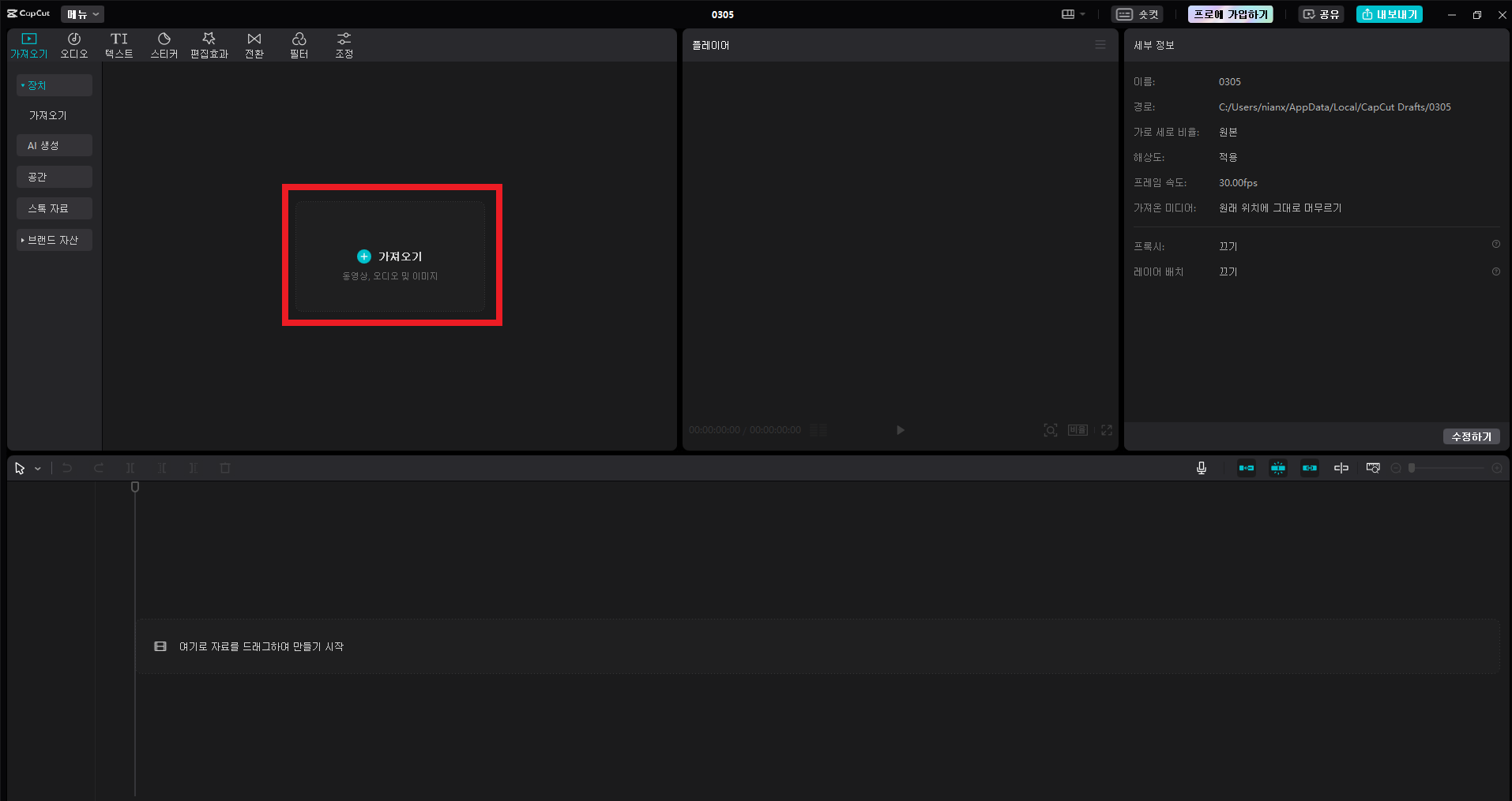 프로그램을 실행하고 '프로젝트 만들기'를 선택하여 새로운 편집 작업을 시작합니다. '가져오기'를 클릭하여 편집할 동영상 파일을 불러옵니다. 캡컷은 다양한 포맷을 지원하므로 여러분이 사용하는 동영상 파일을 편리하게 편집할 수 있습니다.