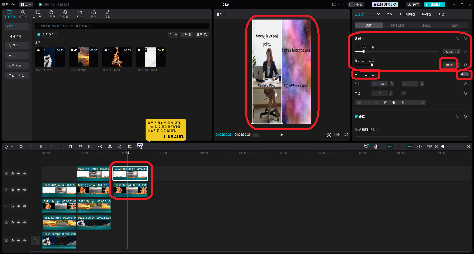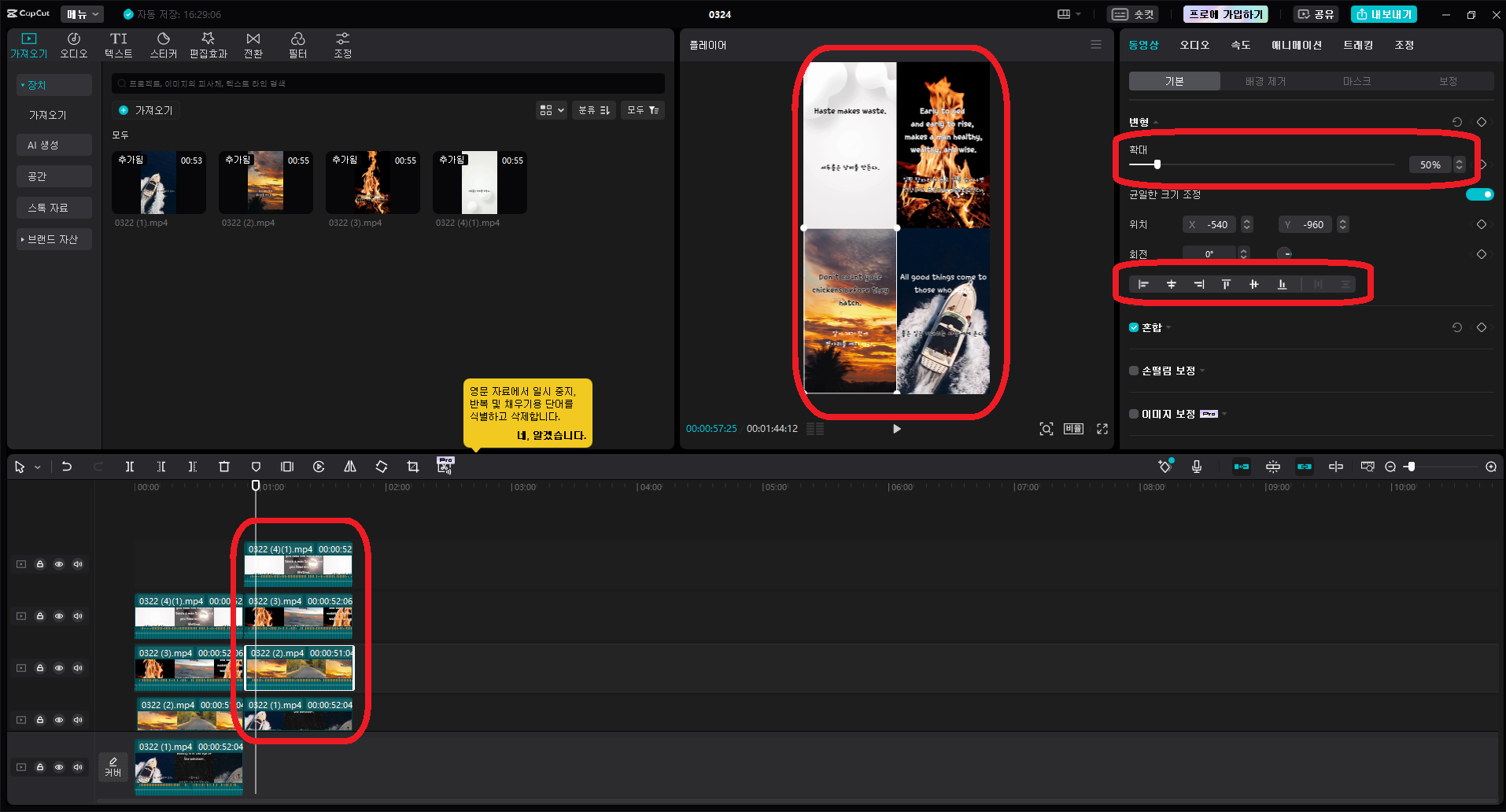 이렇게 영상들을 50% 크기로 축소한 후 원하는 위치에 배치하면, 네 개의 영상이 균일하게 화면에 배열됩니다. 이 과정을 따라가면 영상들이 멋지게 편집되어 한 화면에 보기 좋게 나타날 것입니다.