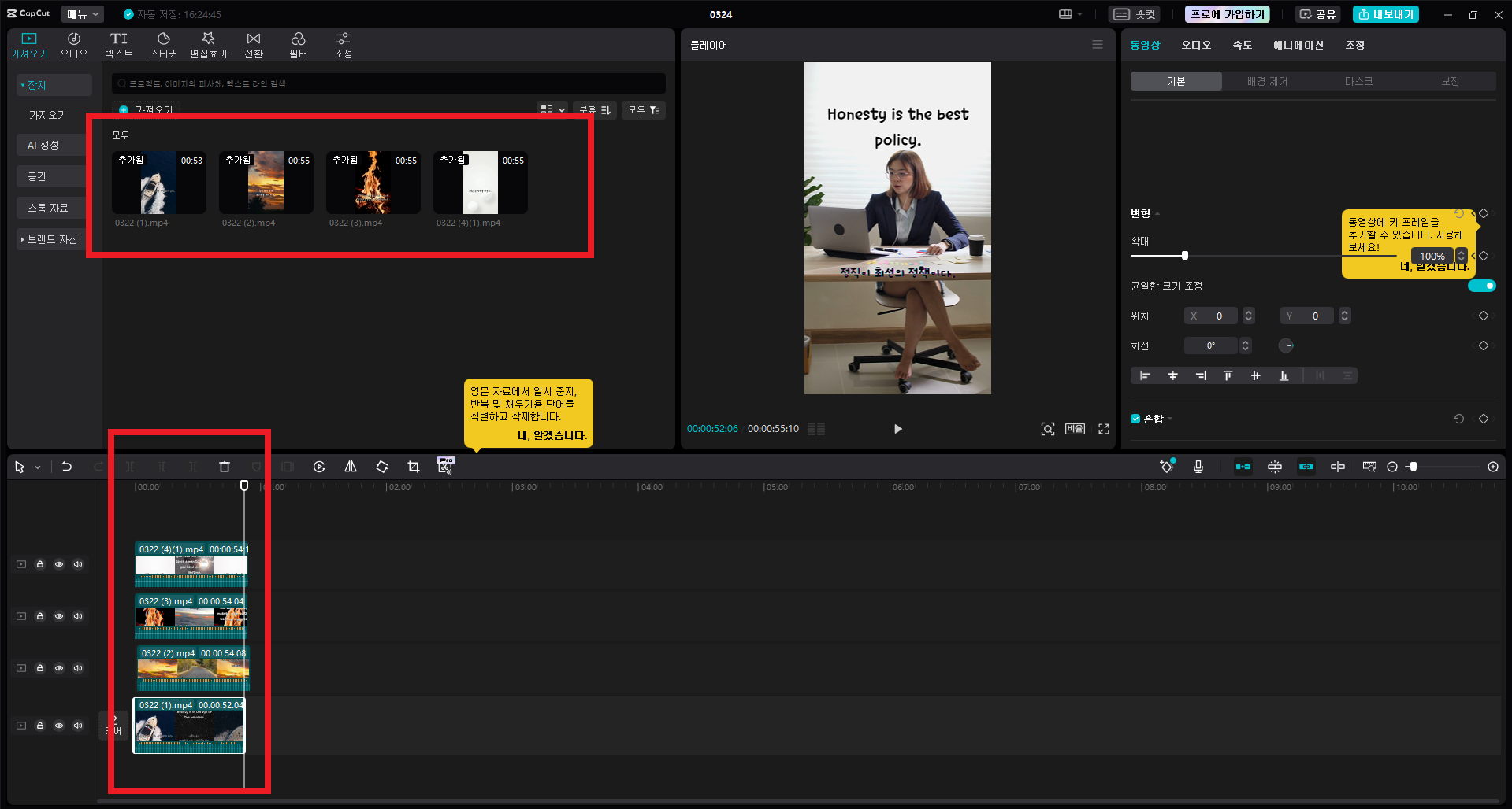 영상 편집을 시작하기 전에 준비된 영상 네 개를 불러와야 합니다. 타임라인에 넣고, 각 영상의 길이를 동일하게 맞추기 위해 가장 짧은 영상에 맞춰서 조정합니다. 그리고 아래에서는 영상을 오른쪽, 왼쪽, 위, 아래로 동일한 간격으로 배열하는 방법을 설명하겠습니다.