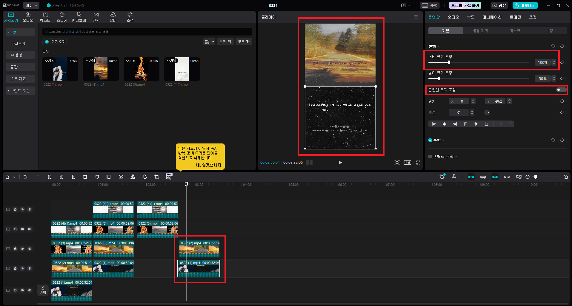 영상을 50%로 축소한 후, 영상을 화면에서 원하는 위치로 드래그하여 이동시킵니다.