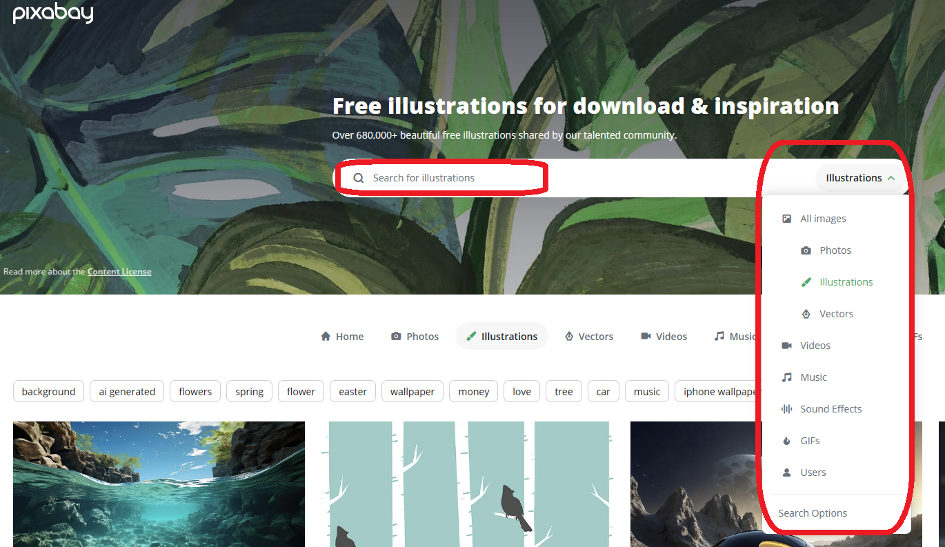 검색 창에 원하는 키워드를 넣고 오른쪽에서 이미지, 사진, 일러스트, 비디오, 음악, 사운드, 움잘 등 선택할 수 있습니다. 먼저 이미지 검색하는 것부터 보여드릴게요.