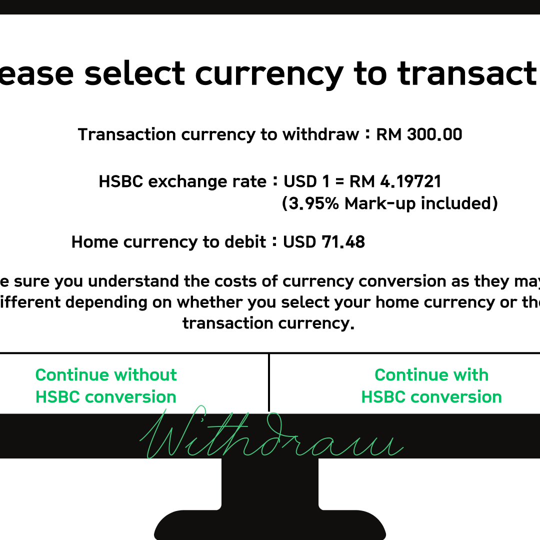 말레이시아에서 ATM으로 현금을 출금할 때, 현지 통화로 출금하는 것이 가장 좋습니다. 예를 들어, HSBC에서 출금할 때 "HSBC 변환 없이 계속하기" 옵션을 선택하면 현지 통화인 RM으로 바로 거래가 이루어집니다. 반면, "HSBC 변환으로 계속하기"를 선택하면 불필요한 환전 수수료가 추가되기 때문에 주의가 필요합니다.