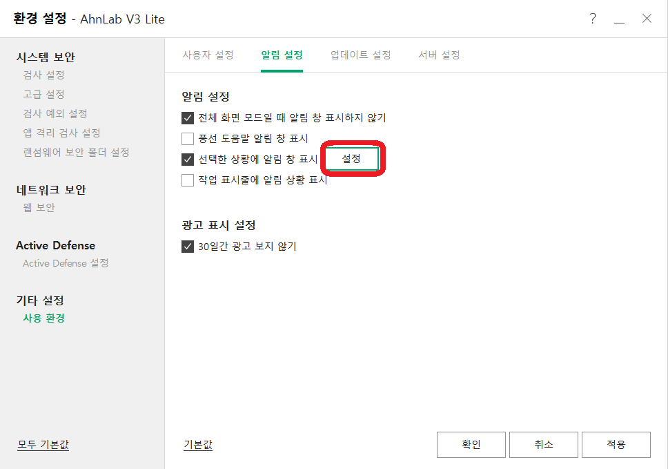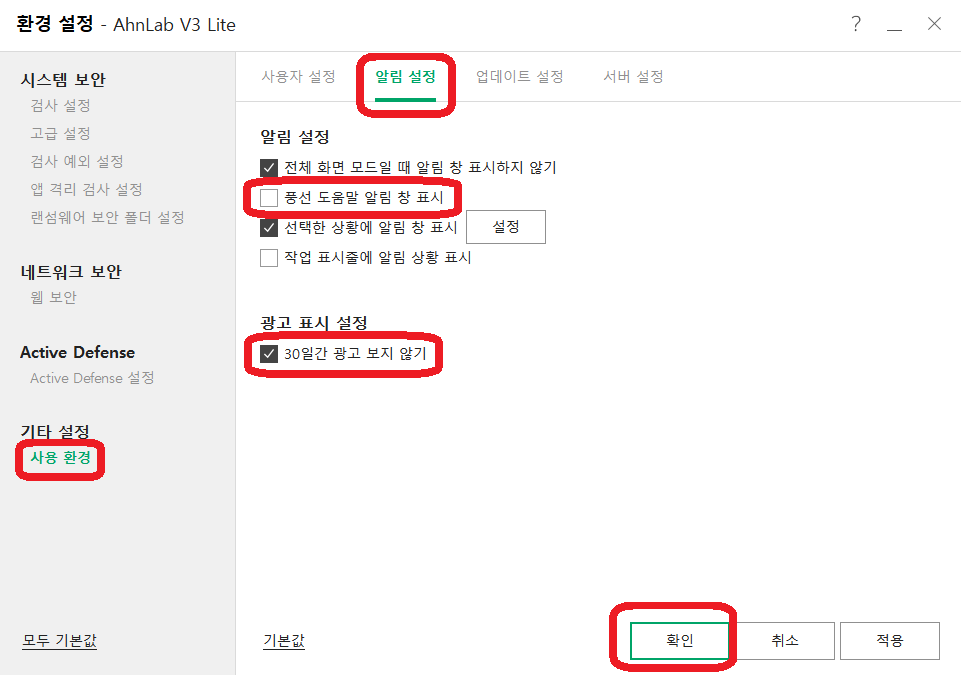 기타설정 - 사용환경 - 알림 설정에서 풍선 도움말 알림 창 표시를 해제합니다. 30일간 광고 보지 않기를 체크는 광고 뜨지 않게 설정하는 방법입니다. 30일 이후 광고가 보인다면 다시 체크해 주시면 됩니다.
