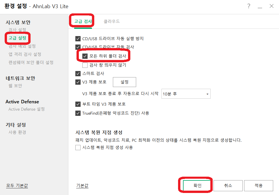 시스템보안 -고급 설정 - 고급검사 - 모든 하위 폴더 검사를 체크합니다.