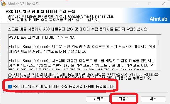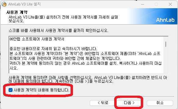 v3무료백신 설치 폴더를 설장한 후 설치 버튼을 누르면 됩니다. 설치를 누르면 사용권 계약이 나옵니다. 동의 박스 체크 후 다음을 눌러 진행합니다.