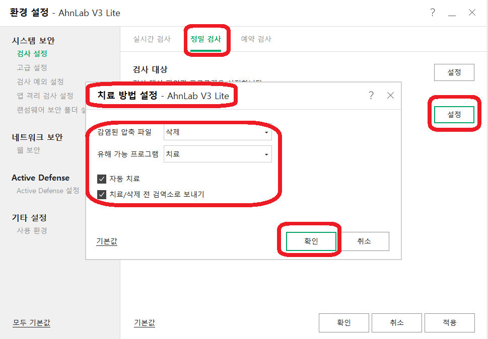 치료 방법 설정에서 감염된 압축파일 삭제로 하시고 자동치료를 선택합니다.