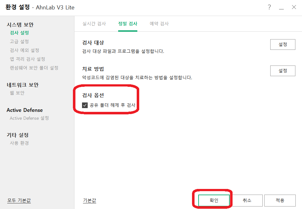 검사 옵션에서 공유 폴더 해제 후 검사에 아래와 같이 체크합니다.