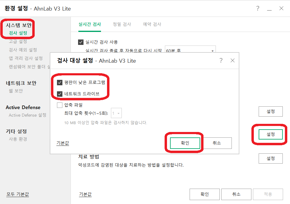시스템 보안 - 검사 설정 탭에서 검사 대상을 설정합니다. 평판이 낮은 프로그램을 체크하고 정밀검사 탭에서 평판이 낮은 프로그램, EML 파일을 체크한 후 설정을 클릭합니다.