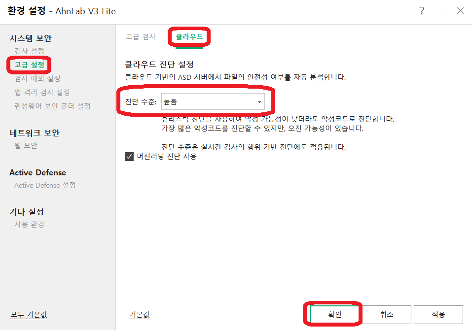 컴퓨터 사양이 낮은 편이라면 기본 설정으로 사용하셔도 되지만 v3 lite는 워낙 가벼운 타입이라서 높음으로 설정해도 괜찮습니다.