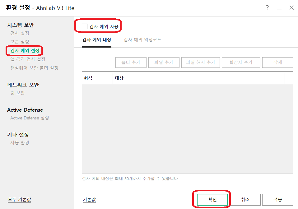 검사 예외 설정 - 검사 예외 사용 체크 해제합니다.